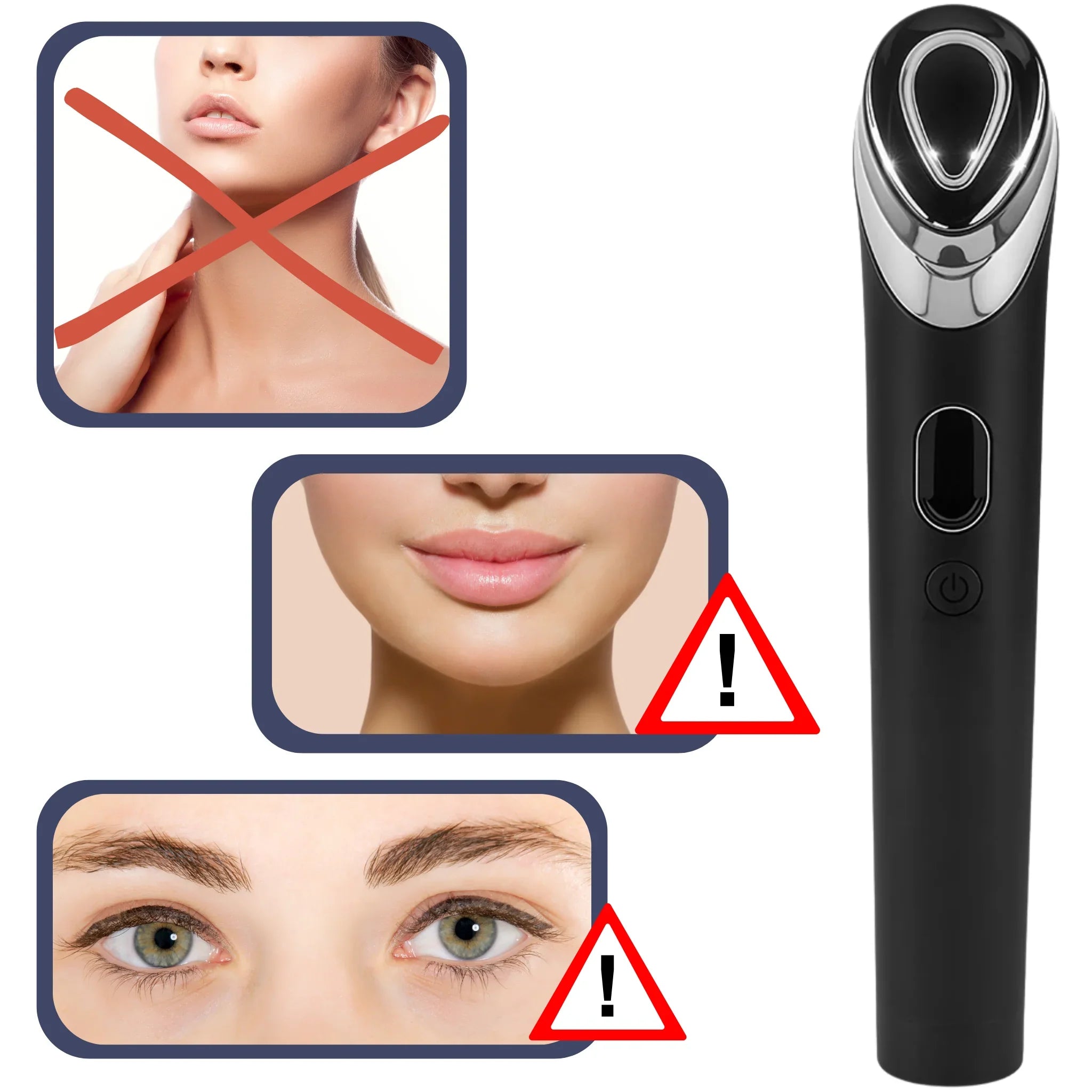 Always place the front of the probe directly on the skin and treat sensitive areas like eyes or mouth with low intensity.