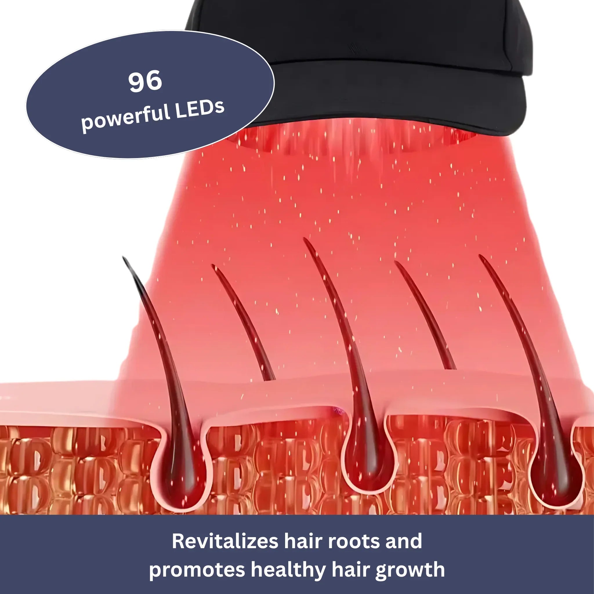 The 96 built-in high-performance LEDs with 660nm and 850nm wavelengths create a precise light spectrum that promotes cell regeneration and boosts scalp circulation.