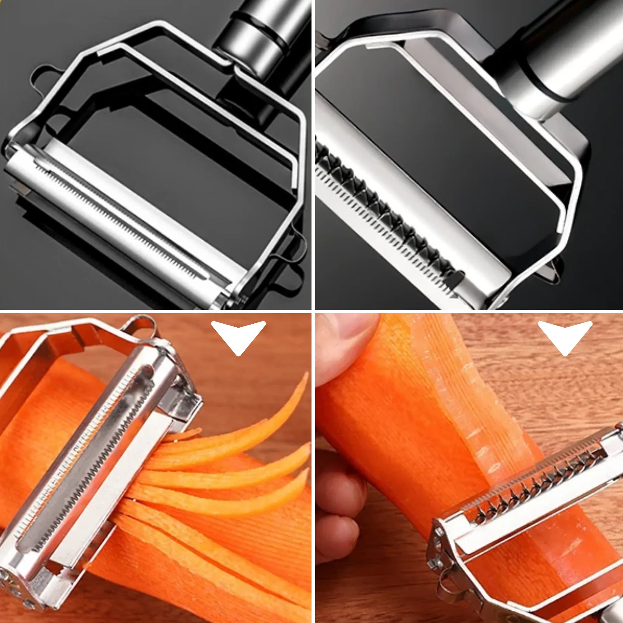 This multifunctional peeler, made from high-quality stainless steel, combines several functions in one compact tool – perfect for fast and practical kitchen work without unnecessary gadgets.