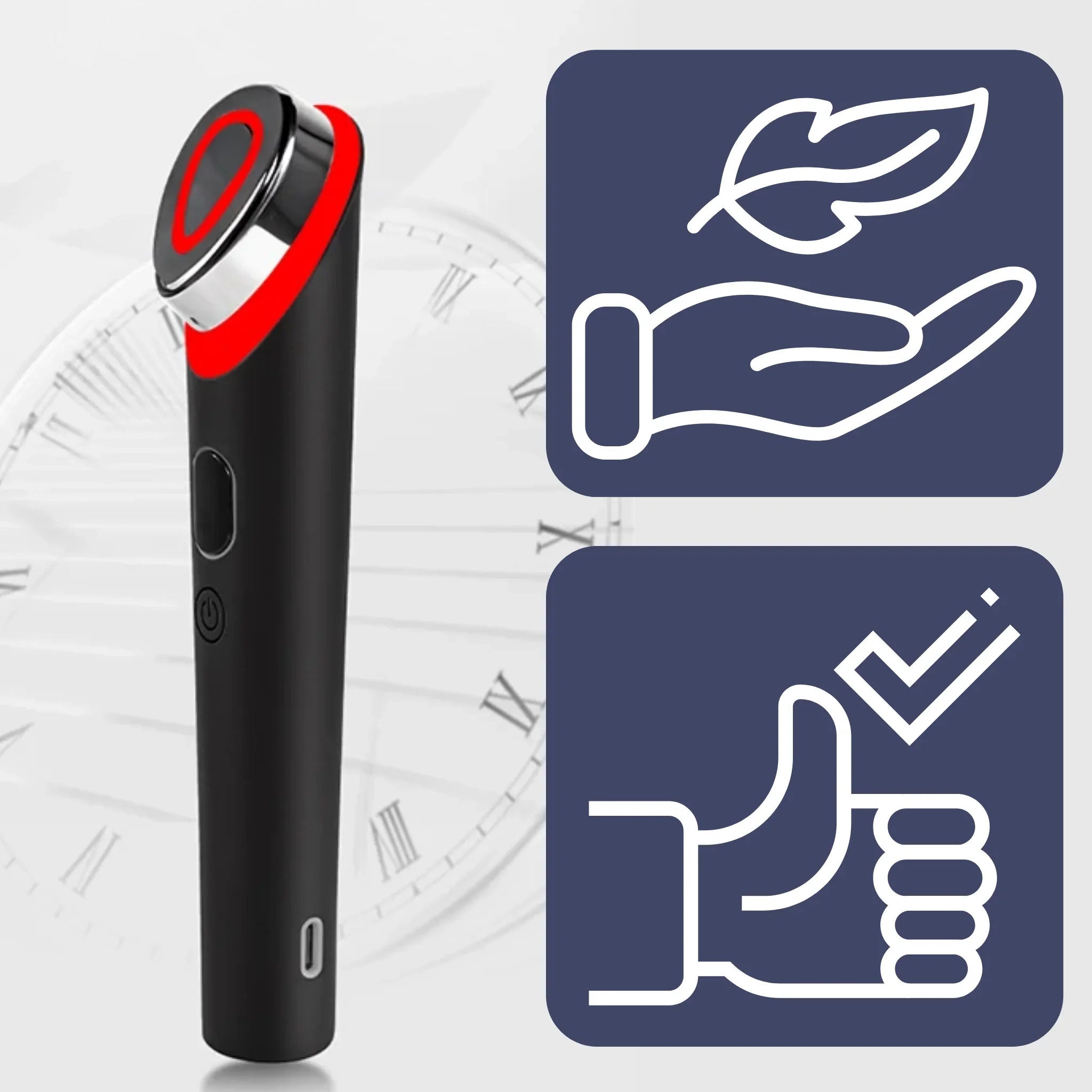 Das Gerät ist für alle Hauttypen geeignet und kann zu Hause sicher angewendet werden, um Haut zu straffen, Poren zu verfeinern und den Teint zu verbessern.