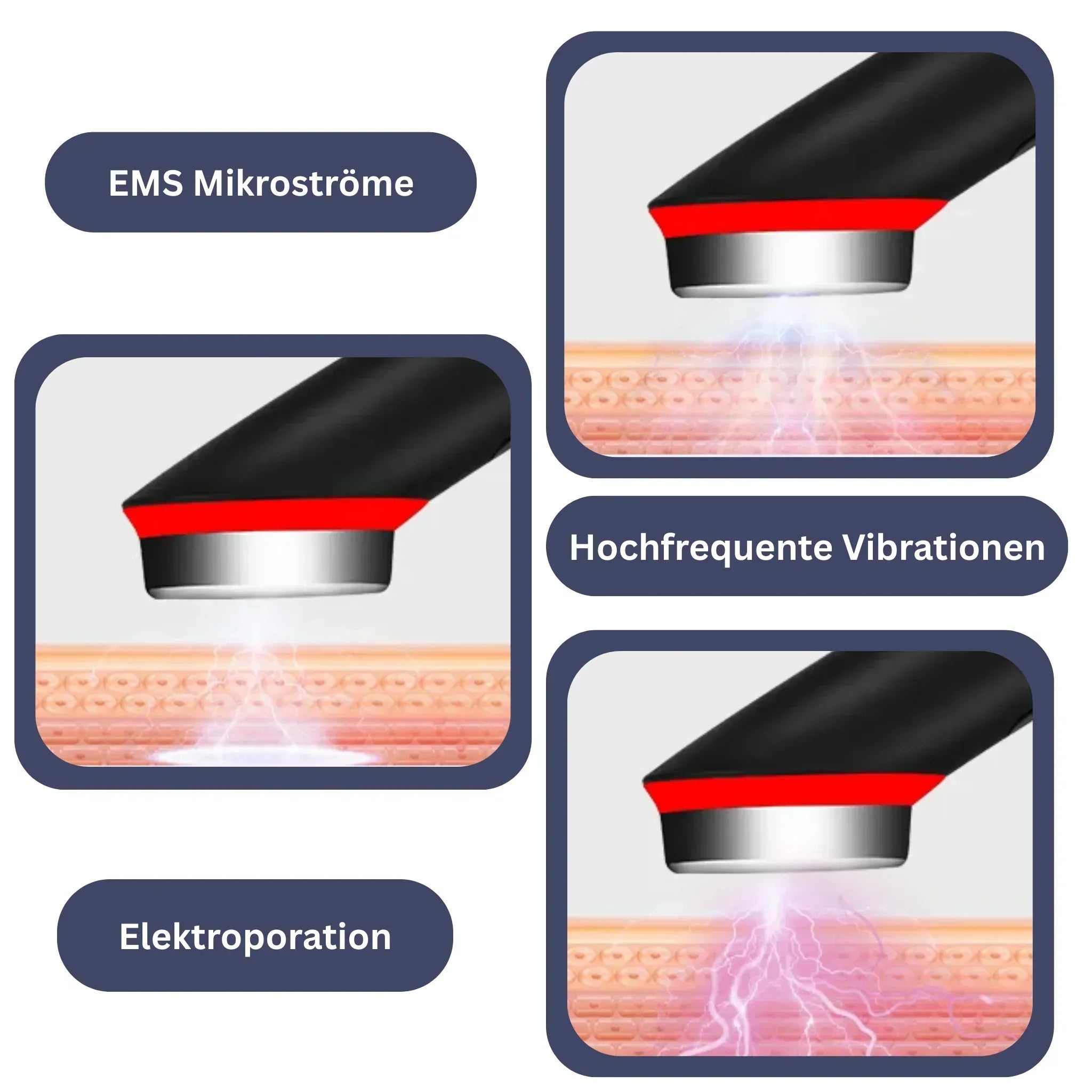 EMS Mikroströme aktivieren die Gesichtsmuskeln und verbessern die Festigkeit, hochfrequente Vibrationen fördern die Durchblutung, und Elektroporation sorgt dafür, dass Seren und Essenzen tiefer in die Haut gelangen.