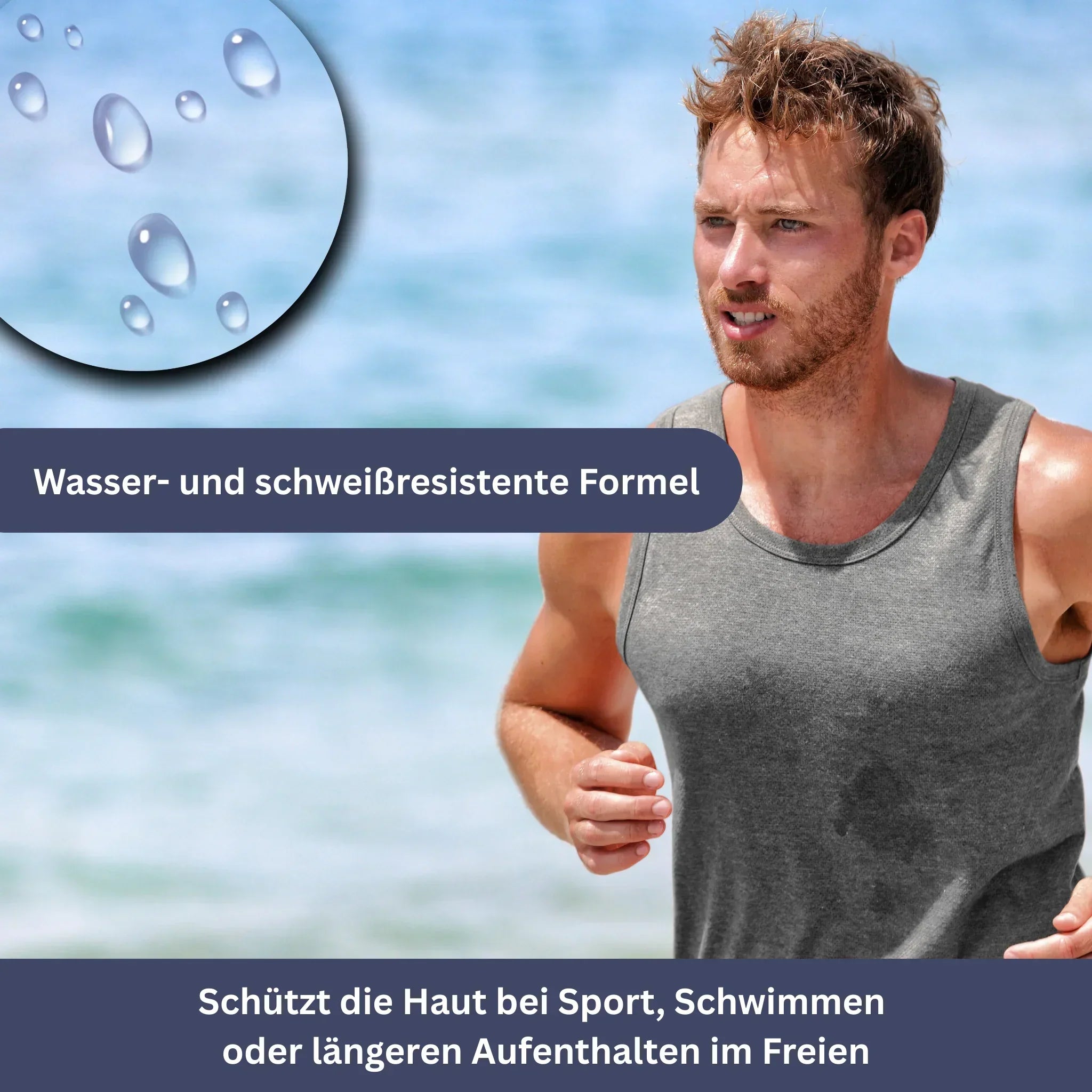 Die wasser- und schweißresistente Formel schützt deine Haut bei Sport, Schwimmen oder längeren Aufenthalten im Freien.