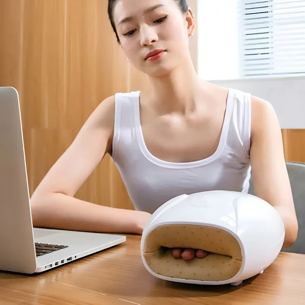 Dieses Handmassagegerät nutzt Luftdruck- und Wärmetherapietechnologie, um durch rhythmisches Kneten reflexologische Techniken zu simulieren, die gezielt Akupressurpunkte in Fingern und Handflächen ansprechen.