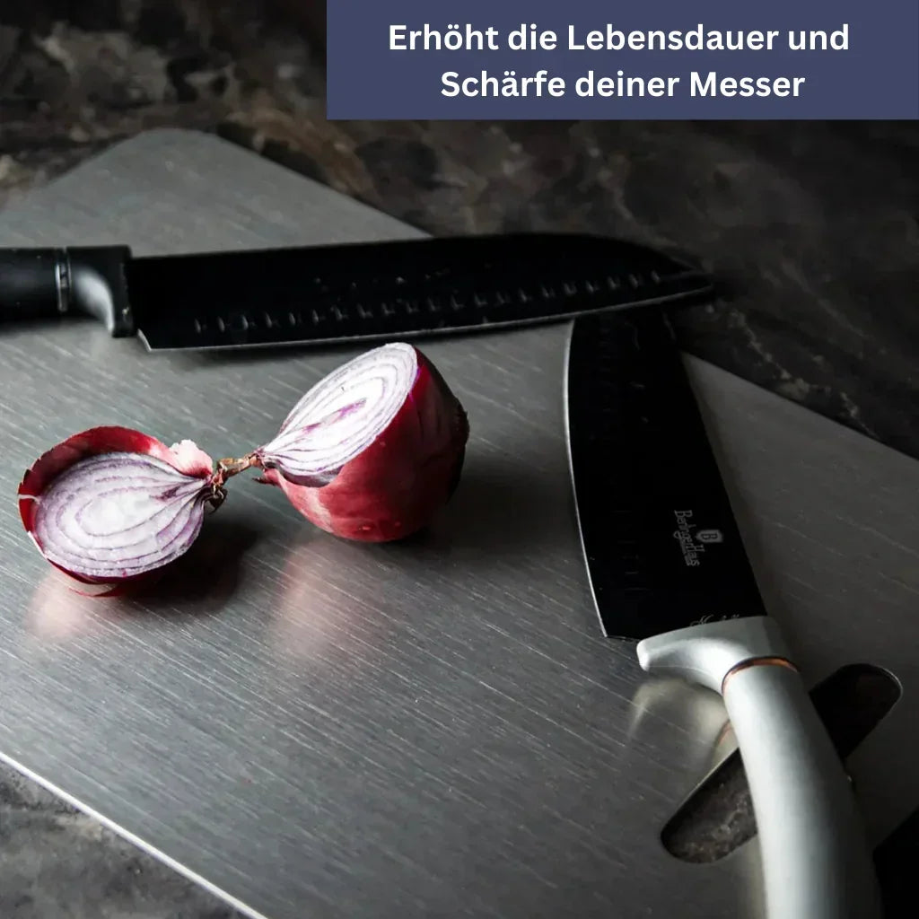 Das SteelMaster Schneidebrett schont deine Messer, da Edelstahl weicher als Stahl ist und die Klingen beim Schneiden nicht abnutzt.